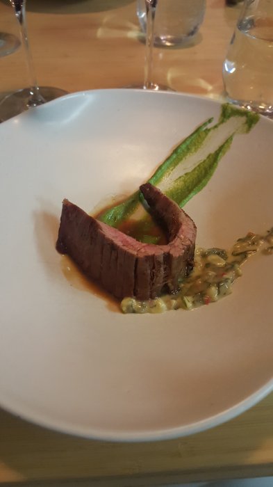 Valet faller på anka med ris. Slut. Han beklagar och berättar att han själv hade hoppats på att få käka lite anka. Får bli köttgryta med potatis istället. Han försvinner in i galley och återvänder omedelbart med varmrätten. Till det rekommenderar han ett glas Shiraz. Maten är okej och vinet väldigt gott.
