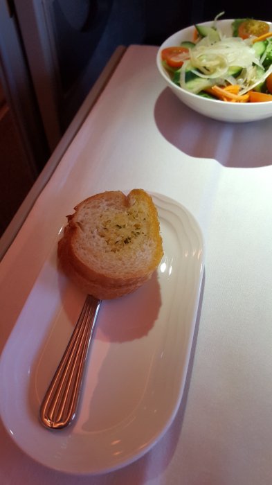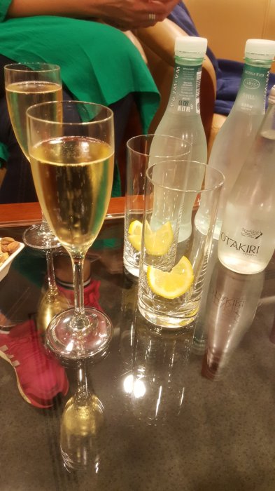 Strax därefter får jag ett glas Dom Pérignon 2006 (eller serverades den parallellt?) och vips så dyker pursern upp i dörren. Ja, dörren, för jag har en sådan, eller ja, två. Han vill bara presentera sig samt meddela att han uppskattar all feedback - bra som dålig.