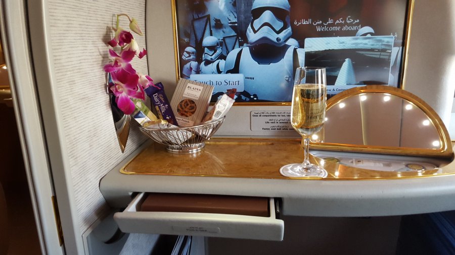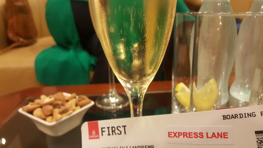 Vi kommer således till flygplatsen tidigt och på gott humör. First class check-in är den mest oinspirerade någonsin. Kvinnan hatar uppenbarligen att folk flyger med Emirates. Trist, men inget att haka upp sig på.