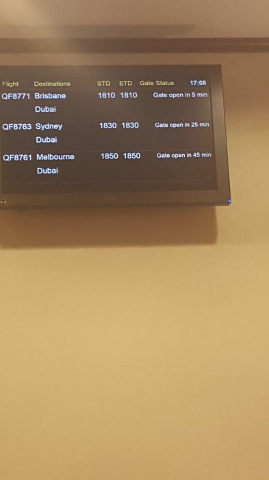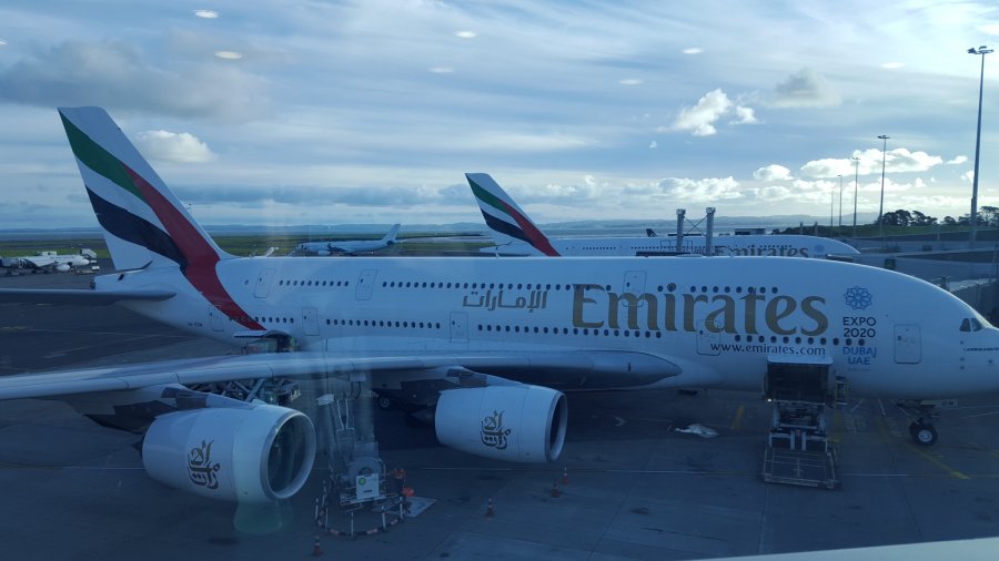 Loungen är gemensam för Business och First och väldigt välbesökt. Emirates har tre flighter som lämnar Auckland för Dubai samma timme. Samtliga har ett kort stopp i Australien. 18.10 till Brisbane. 18.30 till Sydney. Och så vår flight till Melbourne, 18.50.