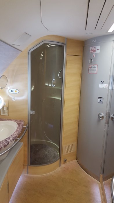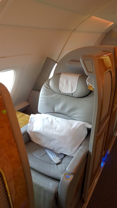 Hon förklarar hur sviten fungerar och frågar om jag flugit First med Emirates i A380 förrut. Jag svarar glatt nej, väl medveten om vad hon skall säga. "Vill du prova vår dusch?". Självklart vill jag det. Hon ber att få återkomma för att ta en tid.