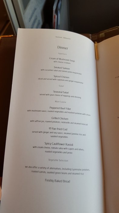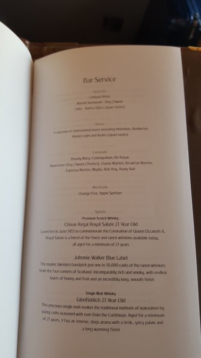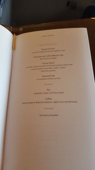 Jag får även dagens meny samt vinlista. Synd att man inte skall vidare till Dubai - då står nämligen kaviar på menyn.