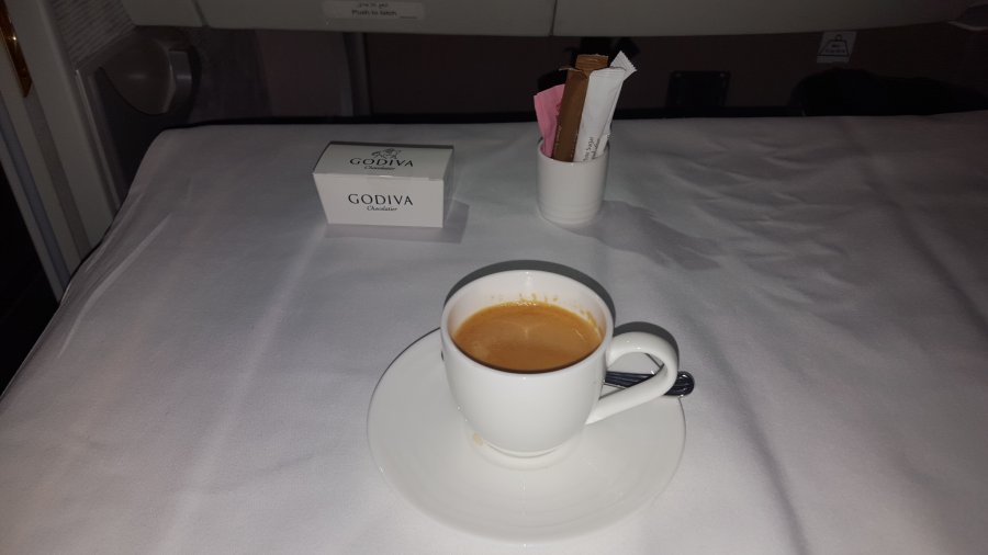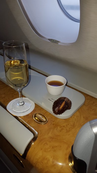 Redan 3 minuter in älskar jag Emirates F. Så serveras arabiskt kaffe med dadlar. Dadeln är magnifik.