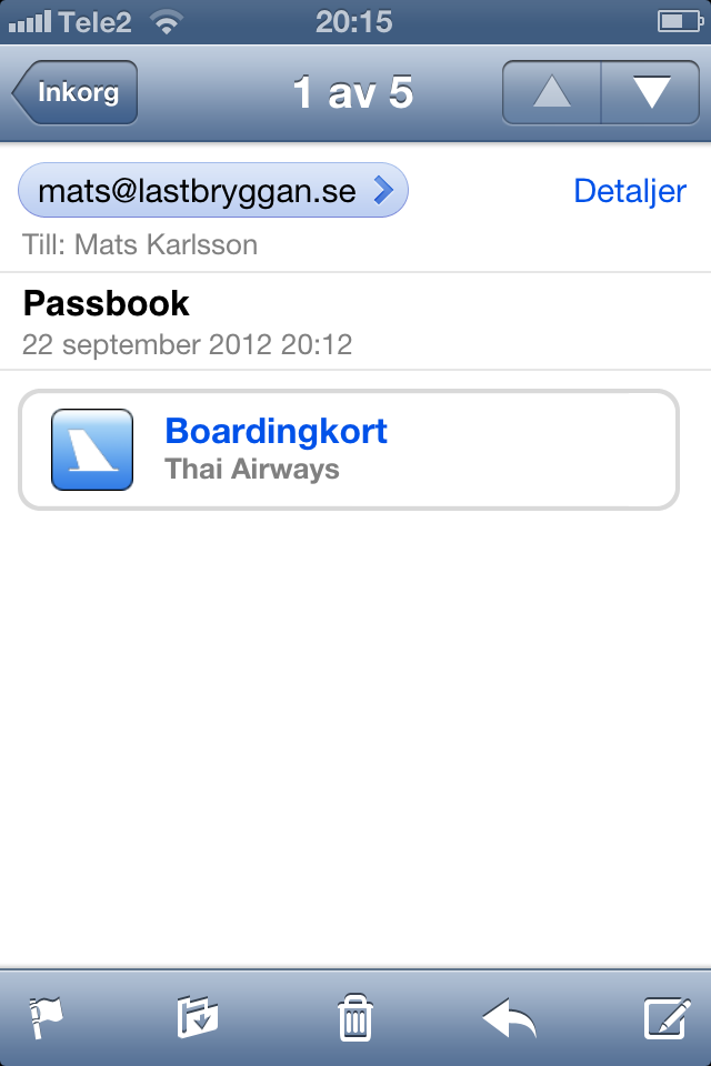 Jag var inne och skapade ett boardingpass på måfå hos TG och när jag var klar laddade jag ner en fil som heter "pass.pkpass" som sedan mejlades och togs emot i telefonen, mejlet såg ut som bilden nedan.