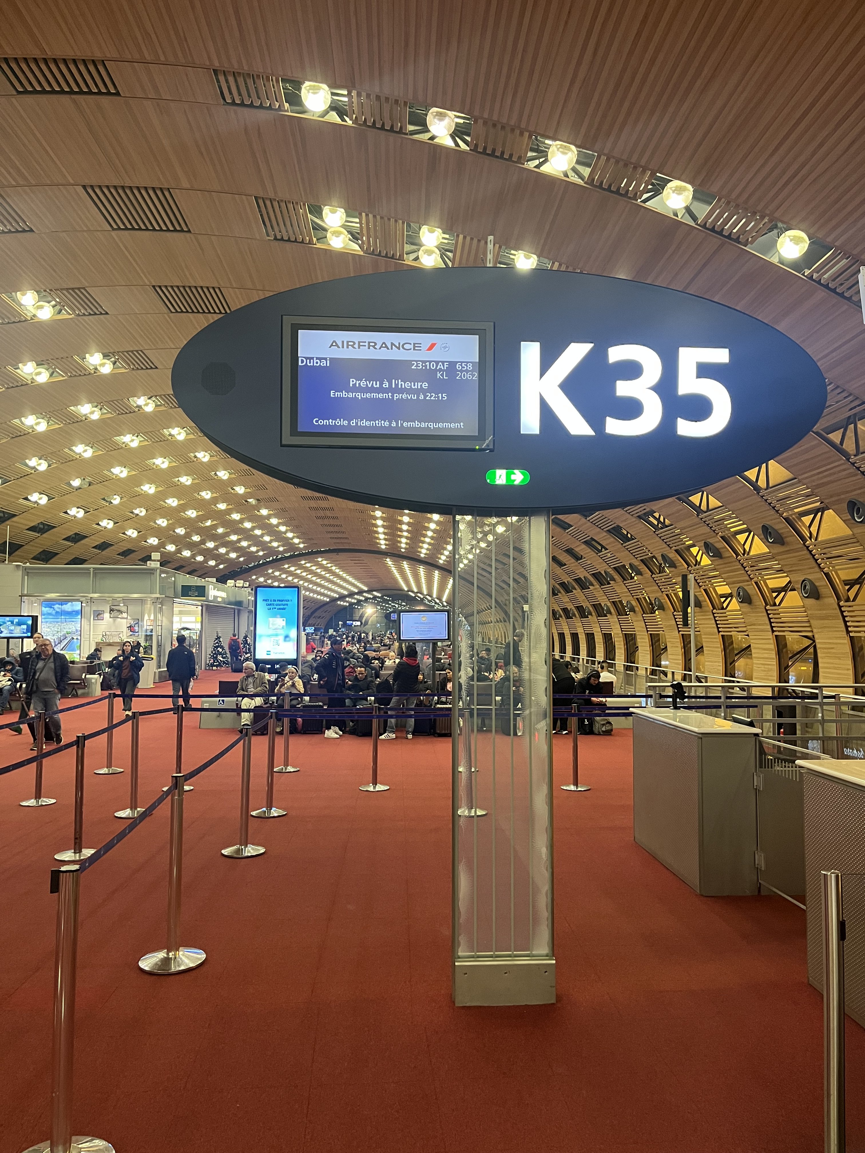 Har nu väntetid på CDG innan nattflyg till Dubai avgår.