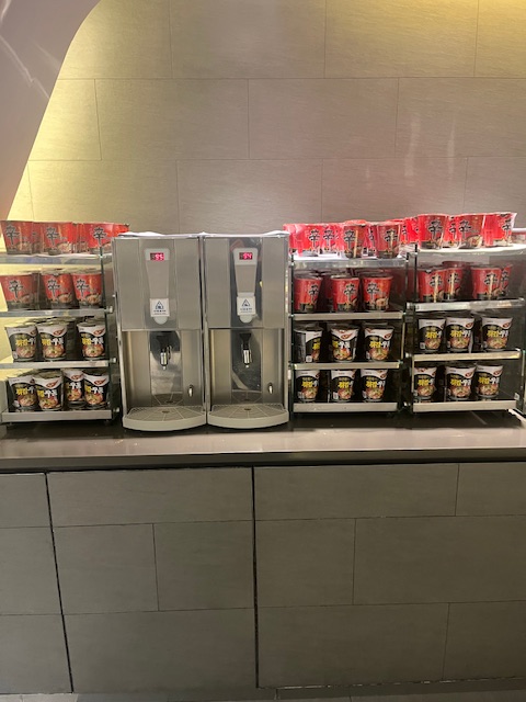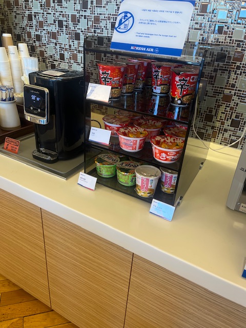 Nu pratar vi big förbättring. Har hamnat i KAL lounge på ICN och jädrar så annorlunda mot Narita. Stort som ett hus, varm mat och tom en bar och för den som vill äta snabbnudlar kan man naturligtvis värma dem själv.