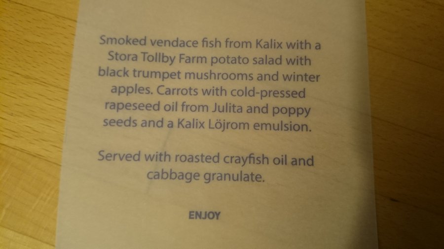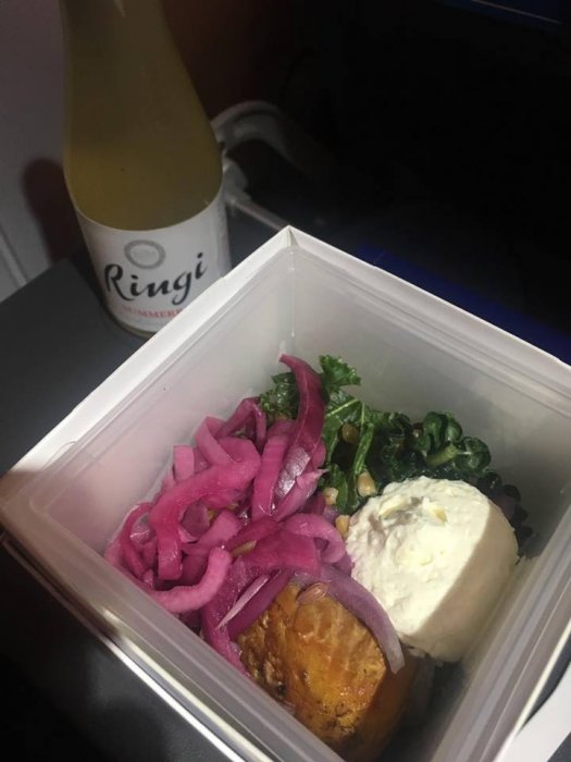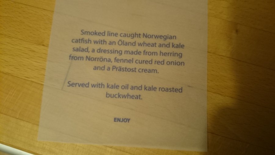På returen serverades det mal. En stor kall brun klump. Den var seg, och med ett tjockt hårt skal, så det var svårt att få loss en bit att äta, men det var inte värt besväret. Det smakade bara rök. Under detta låg bovetet, som hade blötts upp av rökvätskan och var mer som gröt. Ostkrämen hade samma konsistens som smör, så man fick skära(!) krämklicken. Till råga på allt så var muffinbaren undergräddad, så mer som en degklump. Rödlöksbitarna gick att äta. Helt klart sämsta jag någonsin fått ombord på SAS.