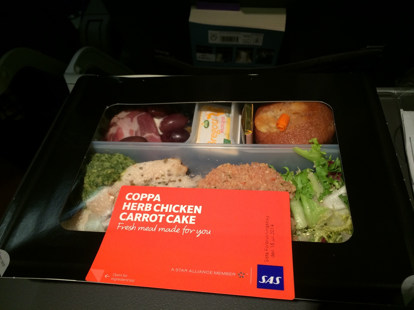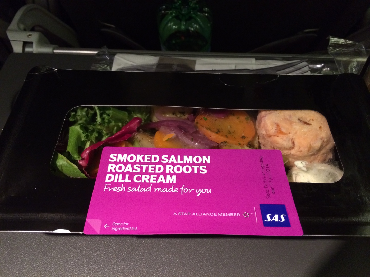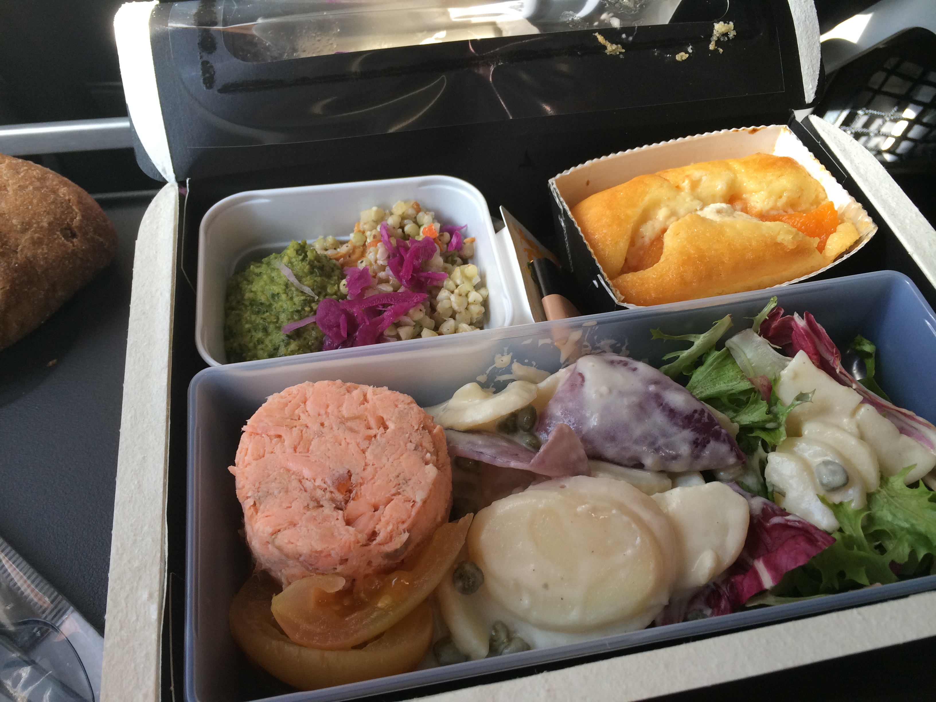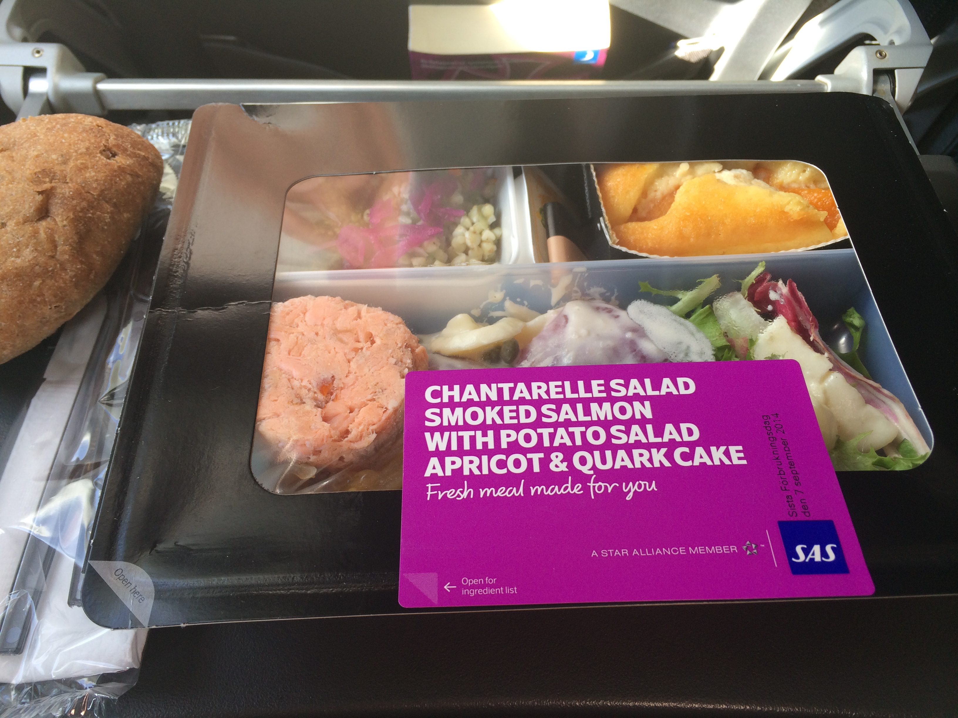 Omdöme: Den i särklass bästa lådan jag käkat i Plus-kabinen. Kantarellsalladen bestod förvisso bara av två små inlagda kantareller men potatissalladen gör sig riktigt bra i lådan och lyfte den annars lite trista laxen. Efterrätten, aprikoskaka - riktigt saftig och läcker. Varmt bröd. Drack vatten ur flaska då det tog så otroligt lång tid att få drycken serverad - osannolika 60 passagerare (tio fulla rader) i SAS Plus på en i övrigt helt full flygning (liksom flighten till Mallis). Heder till crew trots allt.