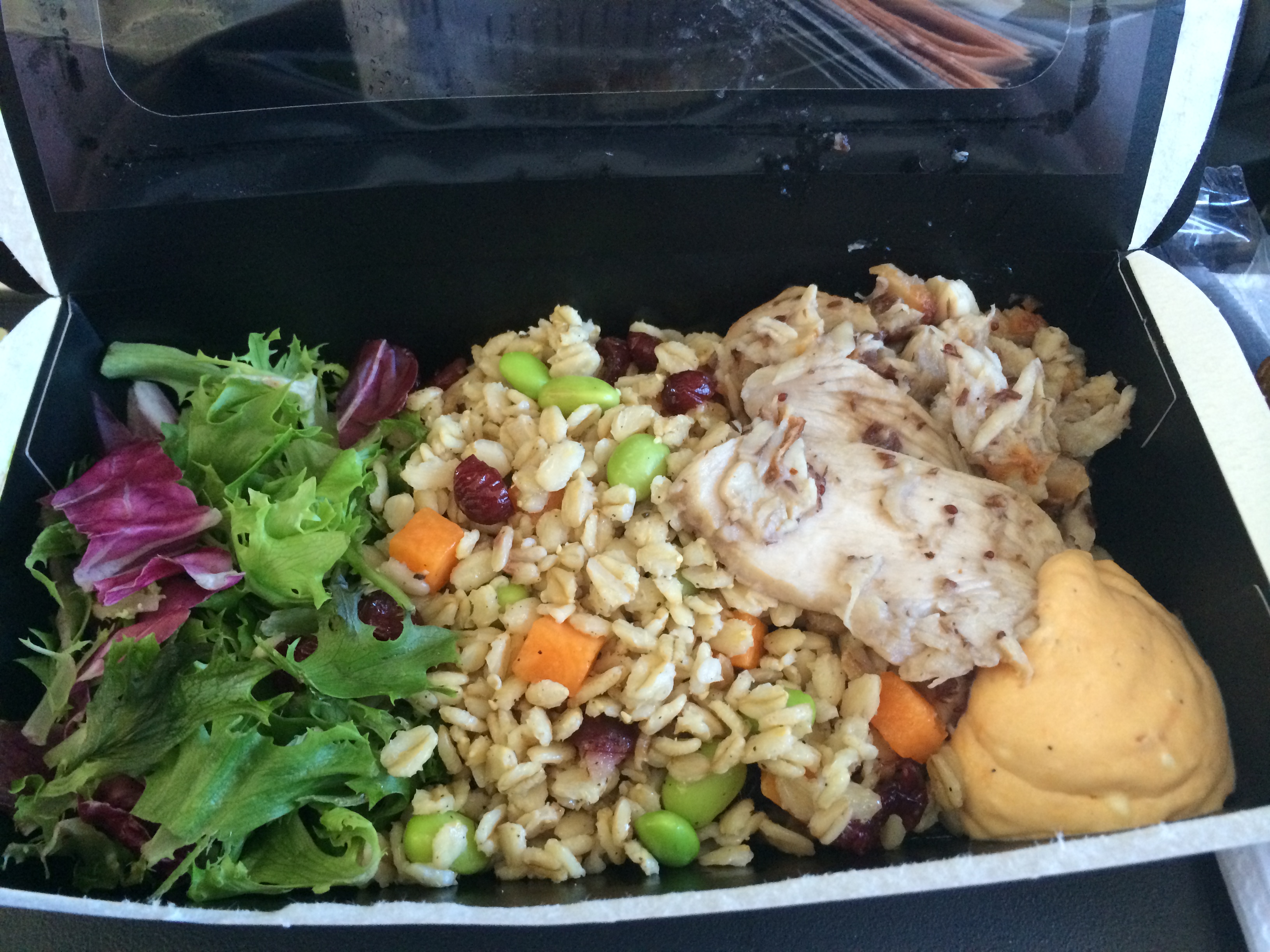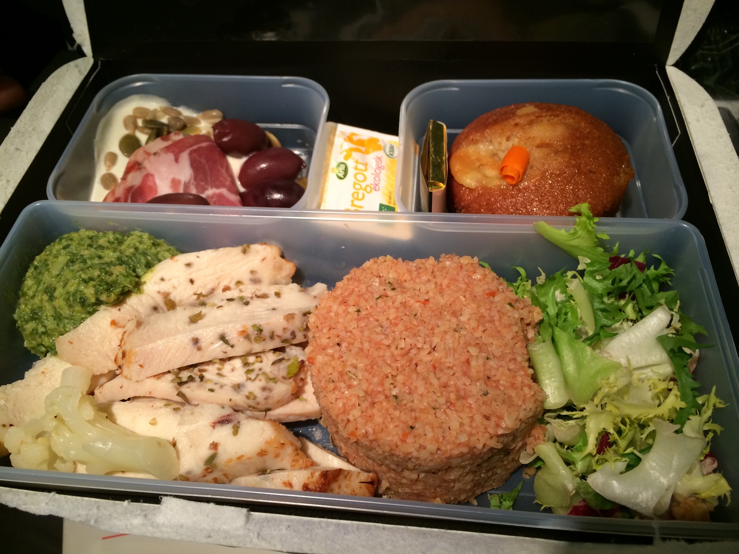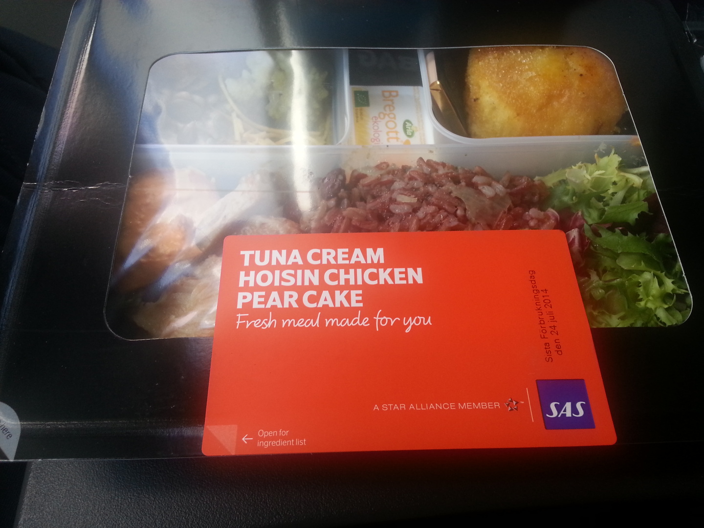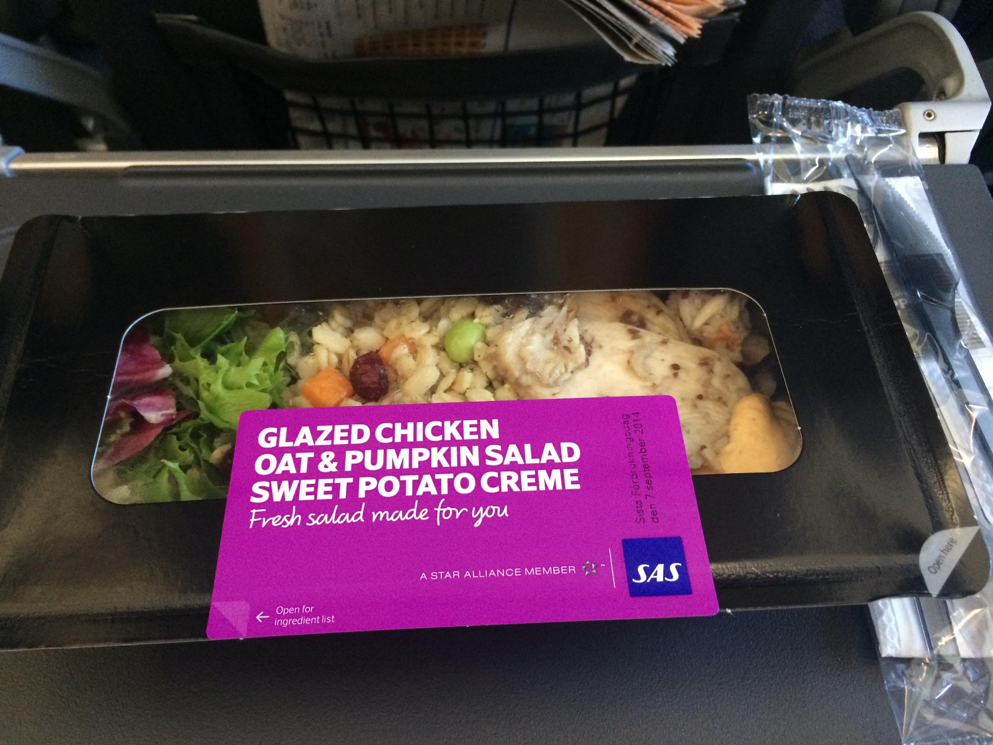 Omdöme: Den i särklass bästa lådan jag käkat i Plus-kabinen. Kantarellsalladen bestod förvisso bara av två små inlagda kantareller men potatissalladen gör sig riktigt bra i lådan och lyfte den annars lite trista laxen. Efterrätten, aprikoskaka - riktigt saftig och läcker. Varmt bröd. Drack vatten ur flaska då det tog så otroligt lång tid att få drycken serverad - osannolika 60 passagerare (tio fulla rader) i SAS Plus på en i övrigt helt full flygning (liksom flighten till Mallis). Heder till crew trots allt.
