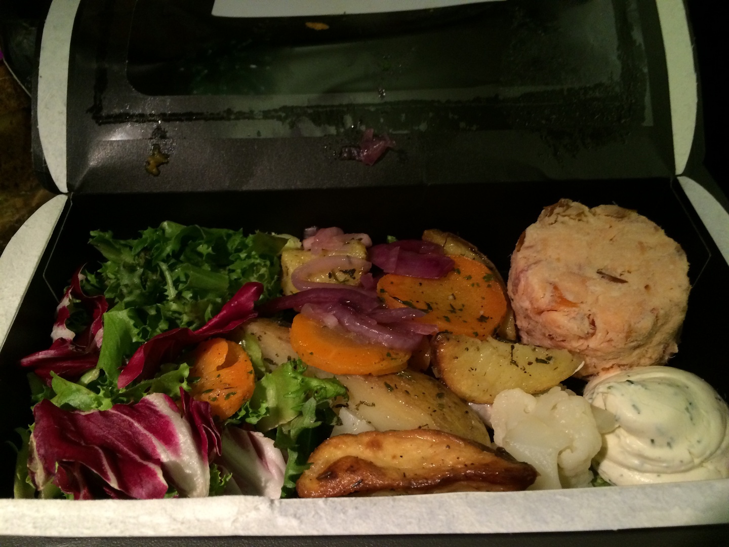 Omdöme: För en gångs skull riktigt god kyckling. Även salladen och "sötpotatiskrämen" var lyckat. Varmt bröd och vin ur Orreforsglas.