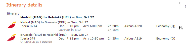 Så flyger BCN-MAD för 45,33 € (billigare än tåget) och så MAD-BRU-HEL för 156,36 €. Fick ringa till AY för min sittplats på nödutgångsraden för BRU-HEL. Flygena med IB fick jag direkt fixade med mitt OWS-status.