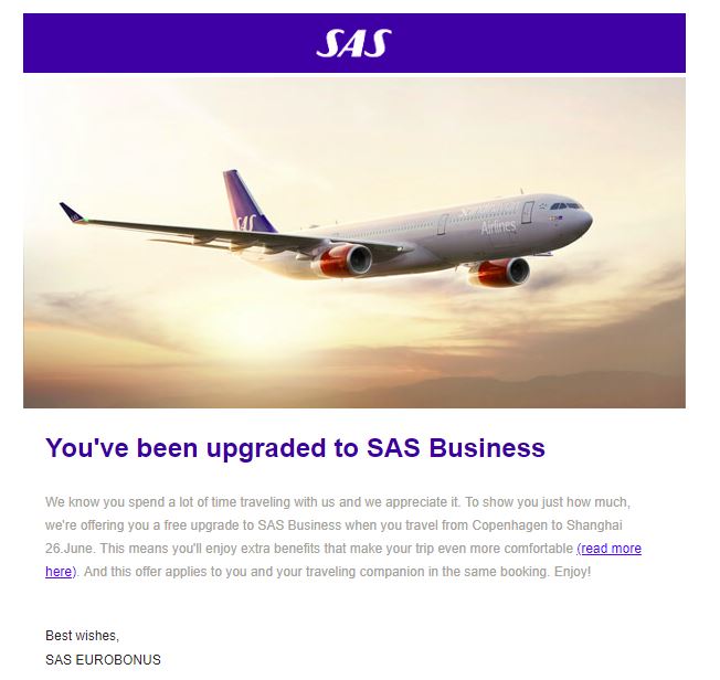 SAS vill bara sälja en plats i business, men det är ganska få säten valda, dessutom vill de bara sälja en i Plus och 1 i Go så jag misstänker överbokning därbak vilket ger dig lite större chanser för en CU, men 5 pax.. Det vore en rejäl CU det, jag har fått Go-Plus för 5 Pers men till Business vore jackpott! Håll tummarna!