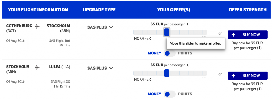 Jag har inne uppgraderingsrequests på flera USA-resor i höst, Plus=>C, för runt 3000 kr och märkte nu att minimibudet på alla resor blivit 3800 kr helt plötsligt. Så om jag ändrar måste jag ta 3800 kr eller högre. (För att få en rimlig chans i "mätaren" måste man lägga 5 000 kr, dvs 10 000 kr tur och retur. Riktigt skämtpris från en dyr Plus-biljett. Då kan man lika gärna boka en business från början ju.) Poänggränserna ligger däremot kvar, dvs från ca 20 000 poäng och uppåt. 25 000 poäng verkar likställas med runt 4500 kr, och då lägger jag hellre 25K poäng.