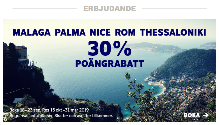 Poängrabatt: 30 % till Palma, Malaga, Nice, Rom och Thessaloniki vinter 18/19