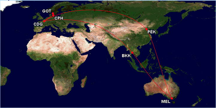 Lyckades också att boka om resan ner från Europa och får testa TG:s A380 i first. (skatter och avgifter blev bara 400 kr mer.) Så här blev det istället: