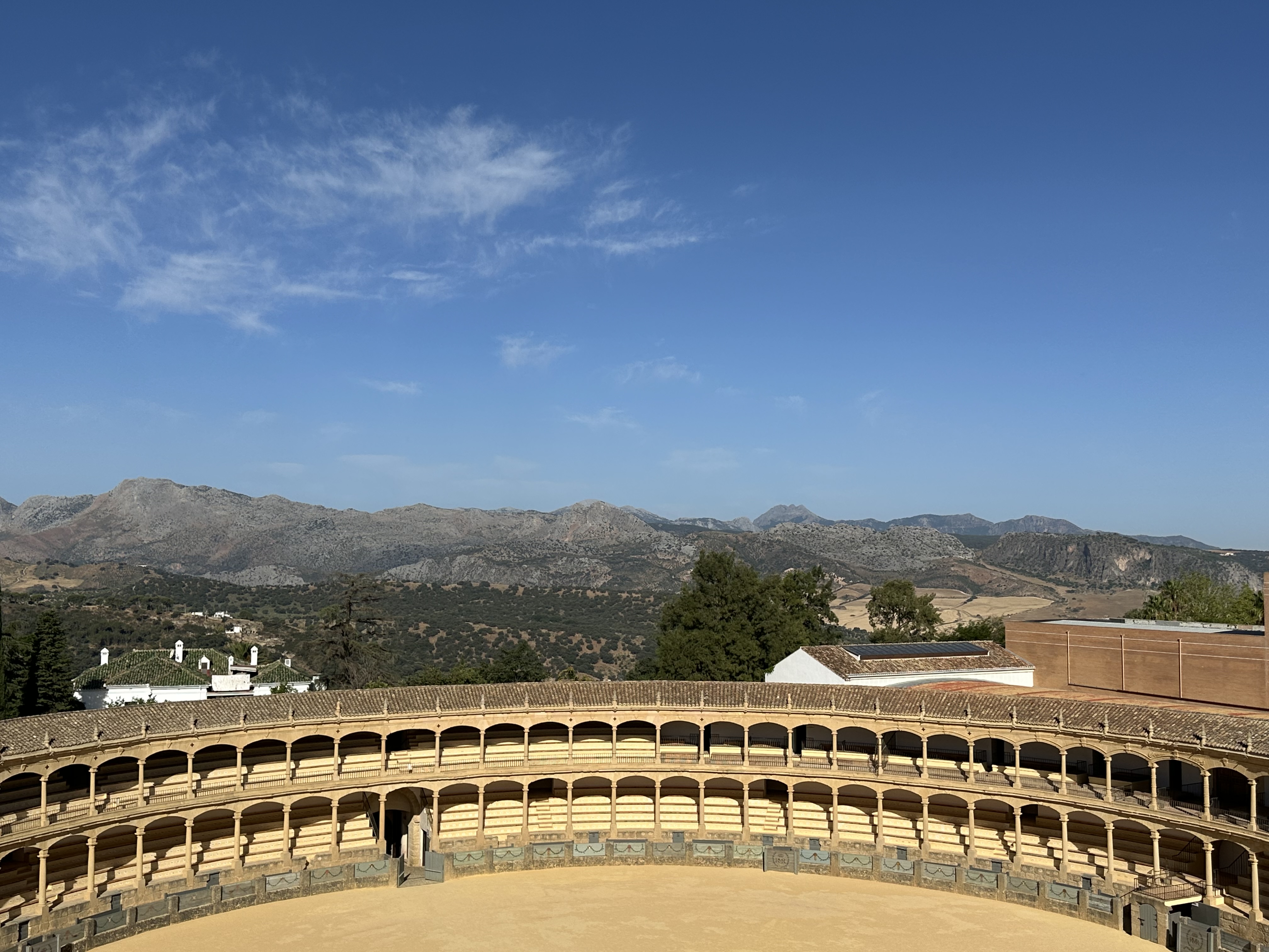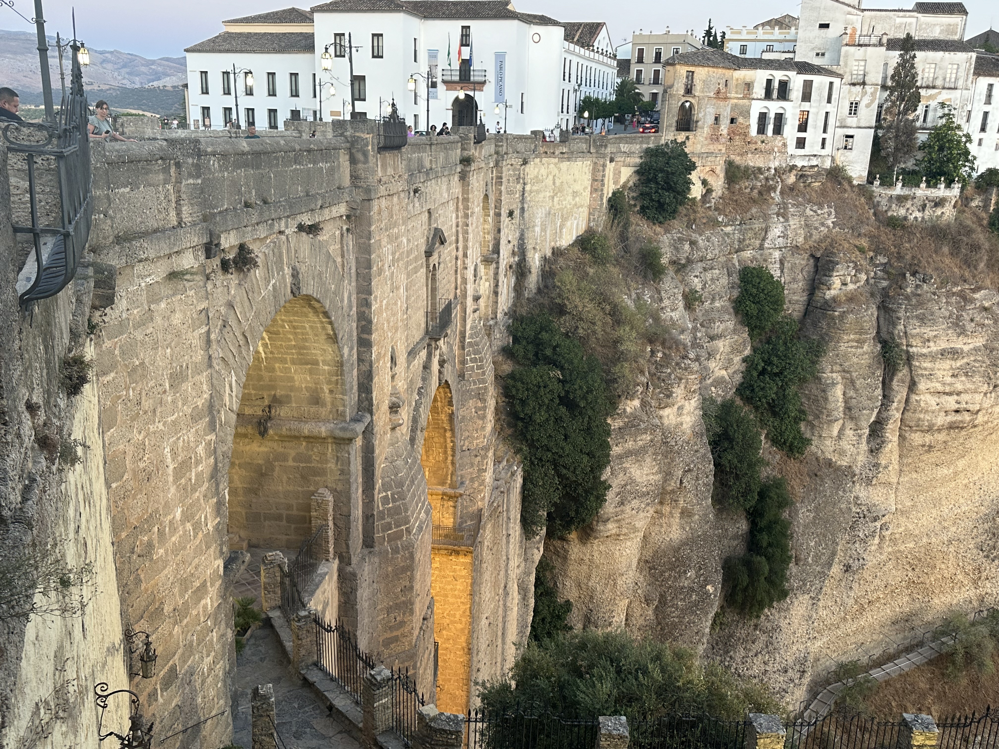 Utsikten är från Catlonia Ronda, 4 stjärnor men väldigt prisvärt, fick en hel flaska Cava (Mosserat vin) och ett fruktfat bara för det faktum att jag var medlem i ”Catlonia Rewards” utan status eller dyl, dock fick man ca 10 % lägre pris…Vi blickar ut mot Plaza de Toros (tjurfäktnings- arenan) och de omkringliggande bergen plus den ”Nya bron”. Hett som i h..e ute, +38 grader och hotellets AC går på knäna. Vi var där i påskas och då var det minusgrader och snö…!!