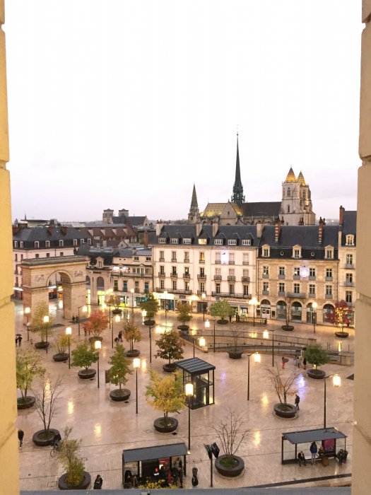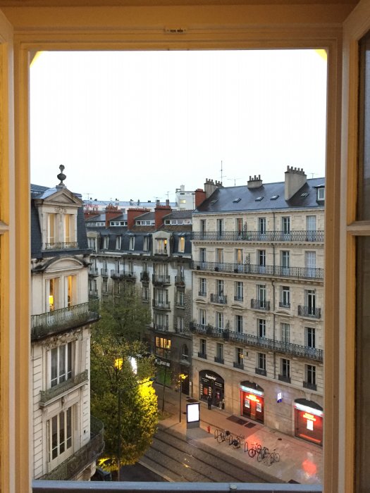 Rum 3072 i Tower 1 på Hilton Union Square. Rummet har balkong med vyer mot stan. Bild 1 fredags kväll runt 23, bild två lördag förmiddag runt 11. Den legendariska dimman är stadigvarande