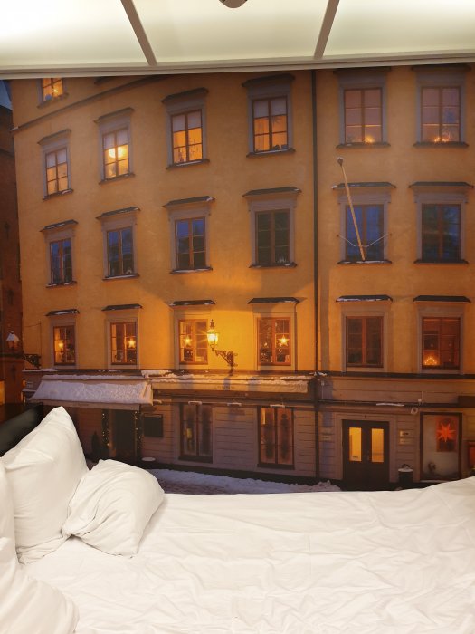 I original-byggnaden, mot framsidan, med full utsikt som Ica Väster. Helt OK rum.
