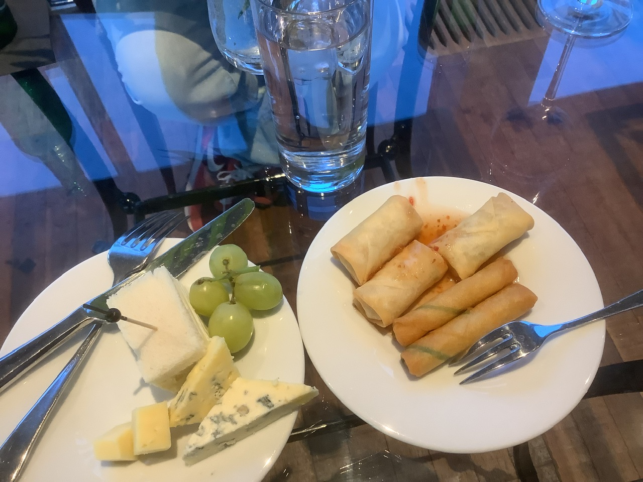 Trevlig buffé med olika ostar, sallad, vårrullar, friterade ostrullar
