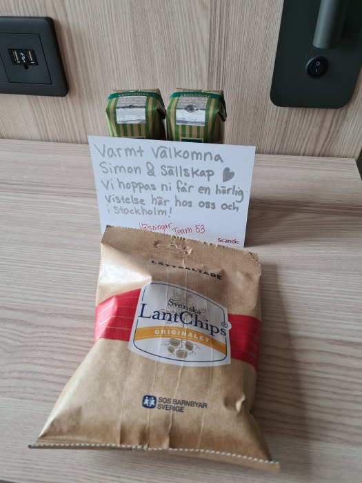 Hotell: Scandic No53 Medlemsstatus: Scandic Top Floor Välkomstgåva: En påse lantchips och två päronjuicer. Även en väldigt trevligt handskriven lapp fanns med, bokade rummet för 2 pers på kampanjen för 450kr natten över påsk så bor 5 nätter för att dunka upp lite extranätter mot RED Level (dubbla statusnätter kampanjen).
