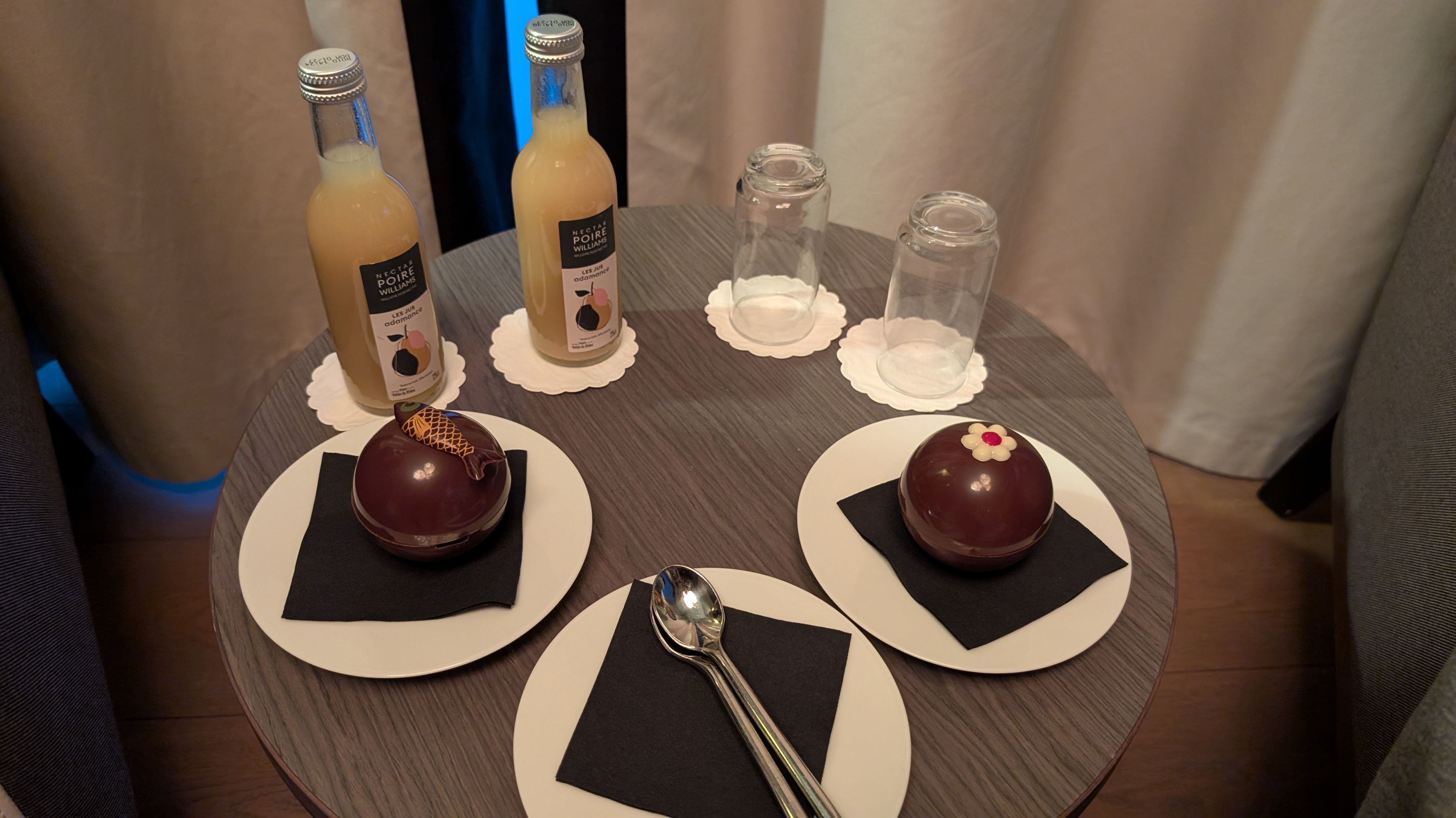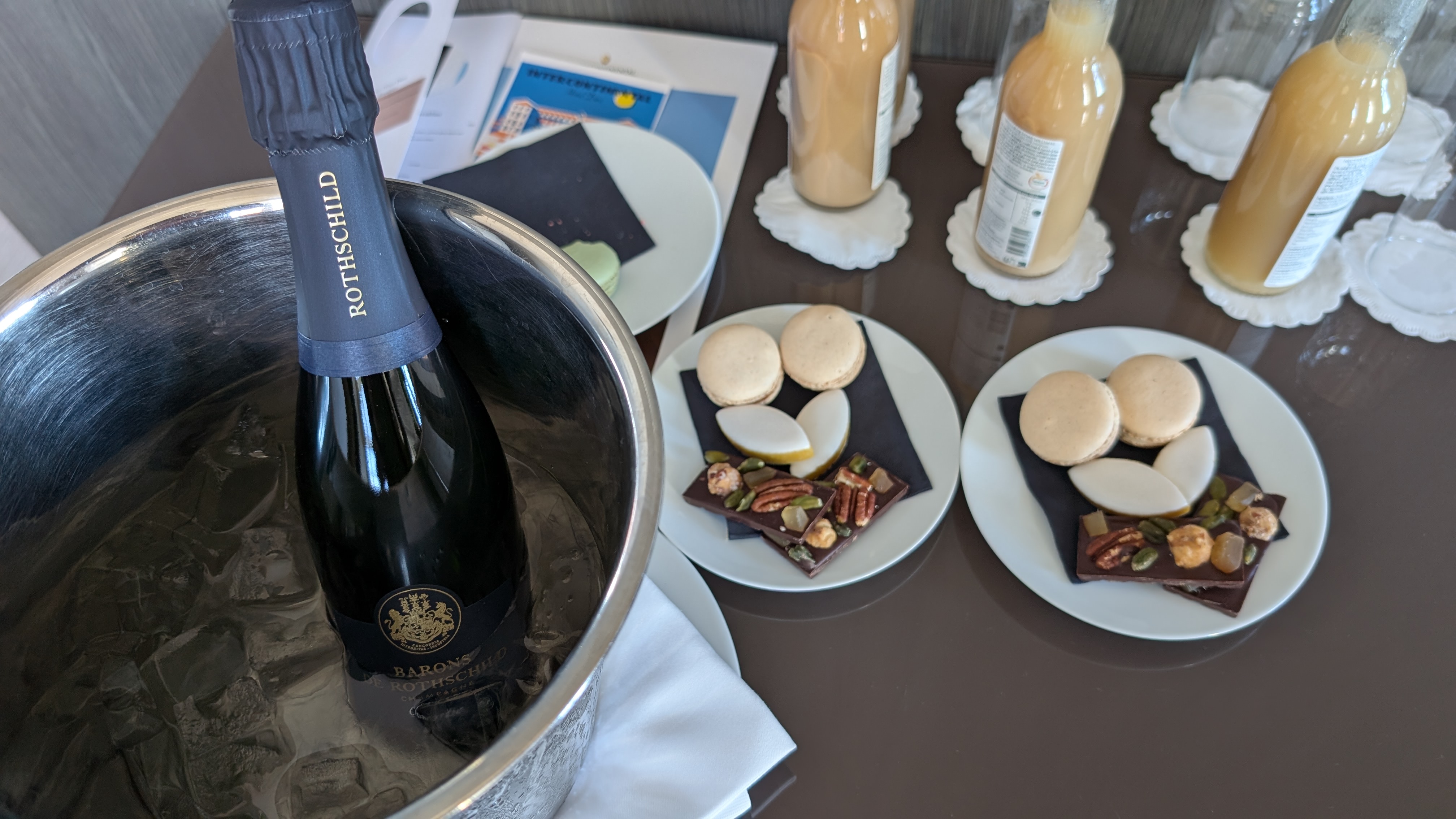Dagen innan avfärd, en flaska champagne med tillhörande läckerier. Å såklart lite... päronjuice