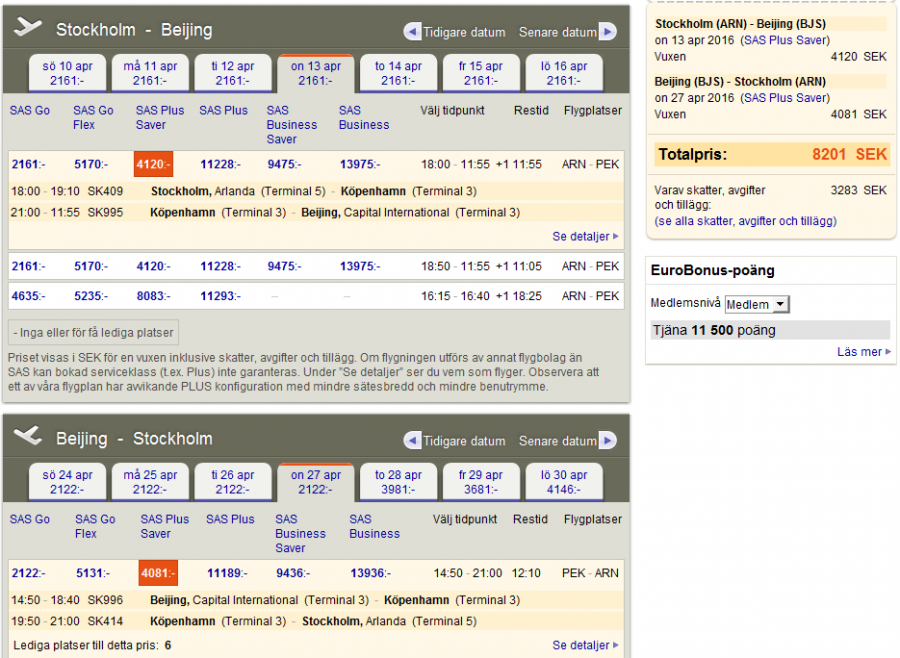 - Beijing: 4.918 SEK (från ca 8.200 SEK inkl. skatter)