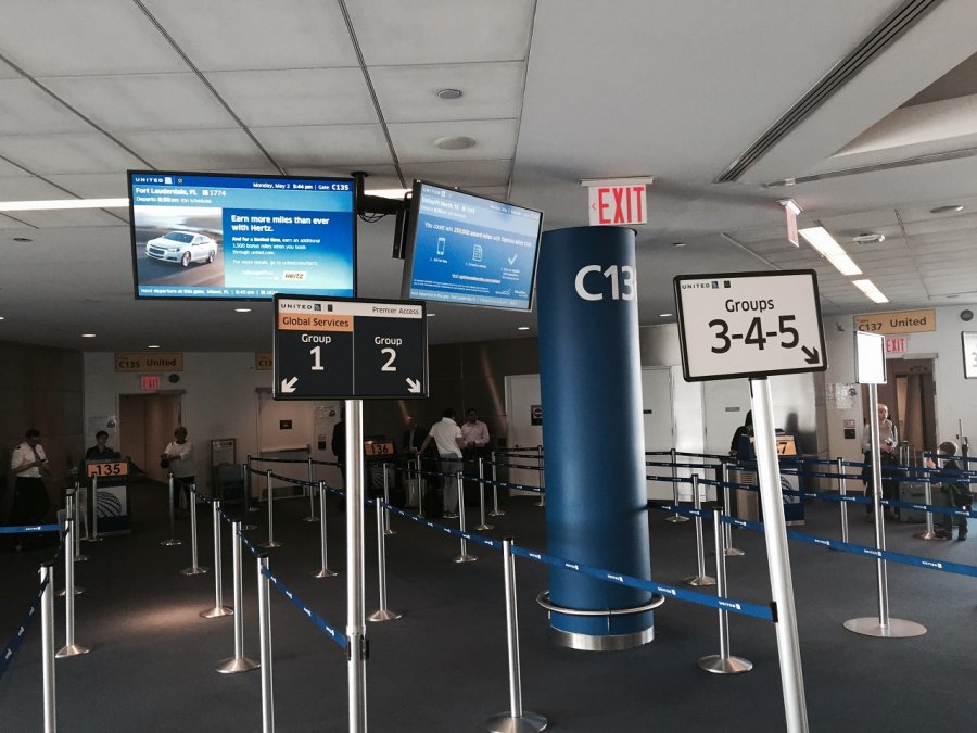Så här ser det ut vid Uniteds gater I USA. Klara tydliga fållor och på alla boardingkort finns det angivet vilken grupp man tillhör. Bl.a First class (domestic) är grupp 1 och *G är grupp 2. Boardingen sker med tydliga upprop.