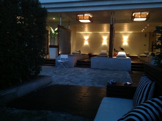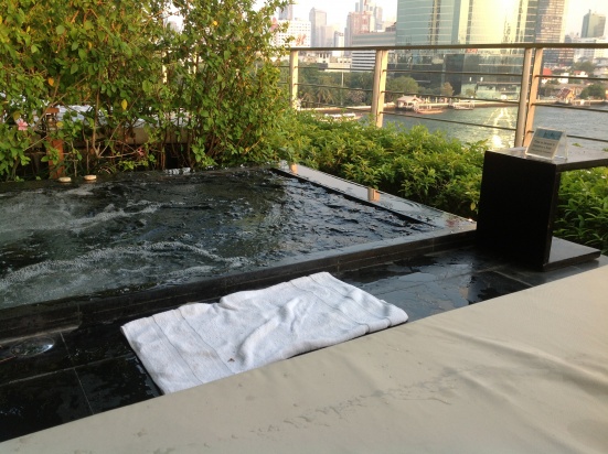 Poolområdet i sig var faktiskt snudd på fantastiskt fräckt medan själva poolen var mycket liten och dessutom till största delen under tak, vilket jag tyckte var mycket märkligt. Det fanns det flera olika miniområden där man kunde relaxa. Till exempel en liten sandstrand med ett par hängmattor, små bås med egen bubbelpool och två solstolar för lite mys, en sandstrand med solstolar och parasoller snyggt ordnade, relaxhörnor med mera...och allt detta på fjärde våningen med utsikt över floden.