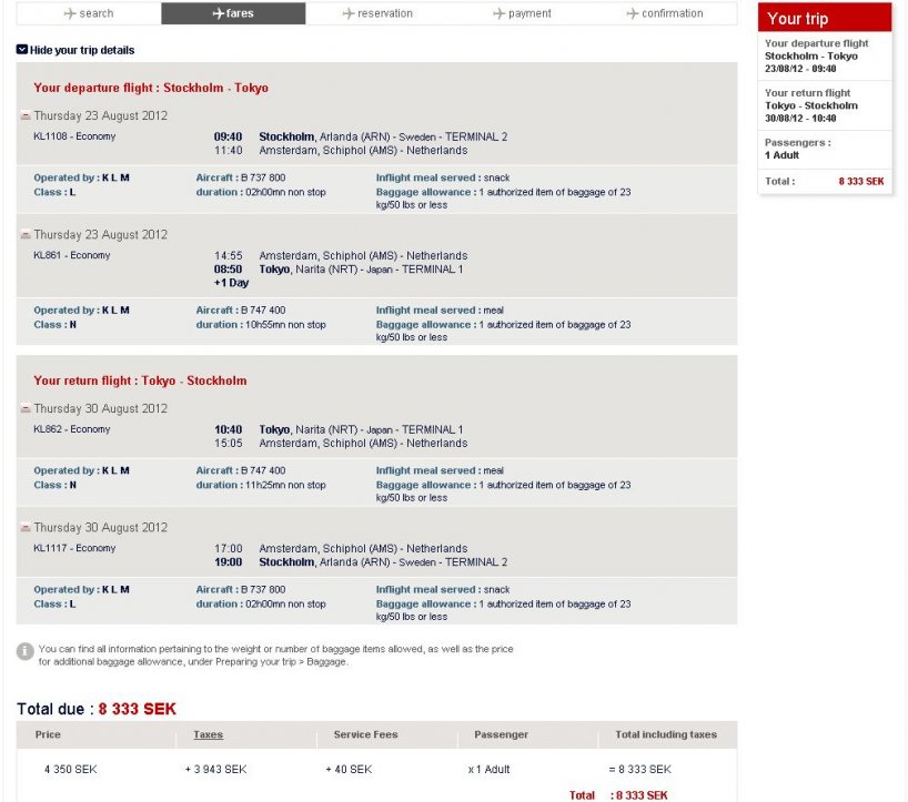 T ex till Tokyo, före rabatten: 8.333 SEK inkl. skatter