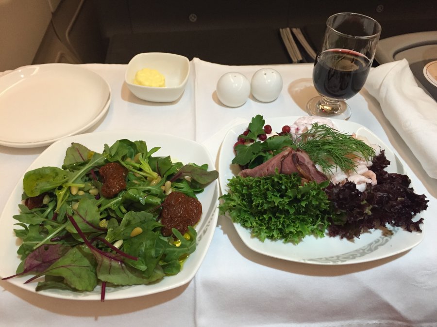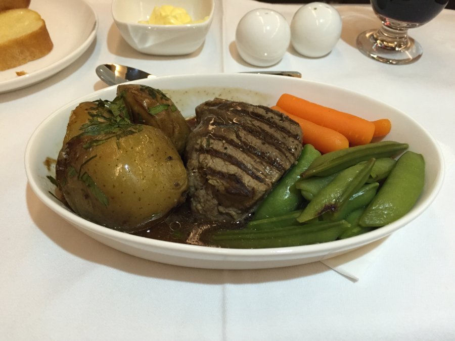 Matserveringen skedde på samma vis som flygningen innan. Menyn drogs tillbaka snabbt och enbart en dryck till all servering. Jag försökte vara väldigt tydlig, vatten till allt förutom huvudrätten, till den vill jag bli serverad rött vin. Det bliv rött vin till allt likt den tidigare flygningen. Nu fick jag dock inte chansen att godkänna vinet, vilket saknades. Drack bara av vattnet. Fick frågan vid förrätten av flygvärdinnan om hon skulle fylla på glaset, så hon tog glaset och kom tillbaka lagom till efterrätten med ett nytt glas vatten.