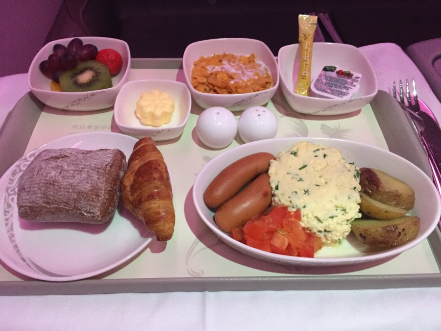 Efter take-off fick vi menyn, och fick välja mellan den västerländska menyn och den kinesiska menyn (båda med två val av huvudrätter). Jag valde middag från den västerländska menyn, och försökte beställa frukost från den kinesiska menyn, vilket tyvärr inte var lastat – så jag fick nöja mig med en västerländsk frukost – kanske bra ändå då jag inte hade någon aning om vad en kinesisk frukost bestod av! Jag bad om att få rött vin till huvudrätten när de frågade vad jag ville ha att dricka. Det innebar att jag fick rött till hela serveringen. Plus i kanten för att de öppnade flaskan framför mig och lät mig godkänna.