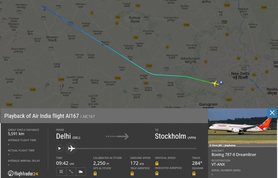Nu är AI167, som flygs med registreringen VT-ANX, i alla fall på väg mot Stockholm.