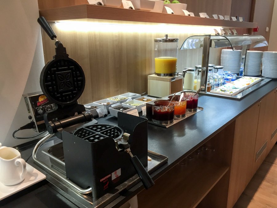 Kommer ner till frukosten vid 8-snåret på lördagen. Finns ingen personal som prickar av och ser att vi har gratis frukost. Då frukost inte ingår så borde de kanske ha lite bättre koll på detta? Det fanns en man som jobbade i frukostmatsalen, men han hade fullt skå med att plocka fram och fylla på tallrikar, bestick etc. Någon avdukning var det inte tal om och någon "cook-to-order" som det ska vara på HGI fanns inte heller. Fanns inget att beställa och endast buffén att välja på. Det fanns en våffelmaskin, men endast en liten kanna med våffelsmet fanns uppställd. Det fanns annars yoghurt, flingor, juice, bröd, äggröra, bacon, bönor i tomatsås och någon korvliknande sak.