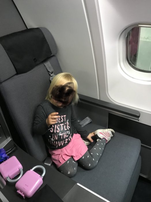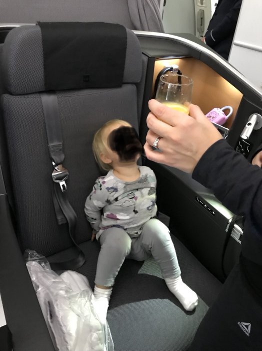Vår äldsta på TG963 ARN-HKT Februari 2016 som då var 11 månader. (Firstkabinen användes som business från ARN på den tiden)