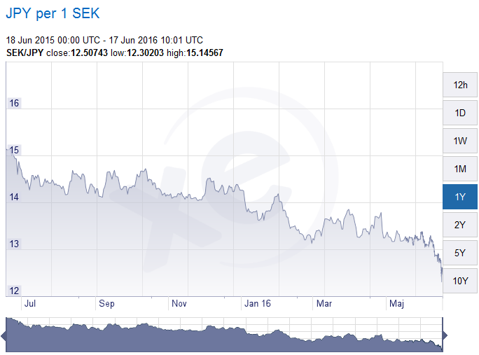 Ett år sedan kostade 1 SEK ca 15 JPY. Idag är 1 SEK värd ca 12,50 JPY.Ca 16% minskning mot JPY.