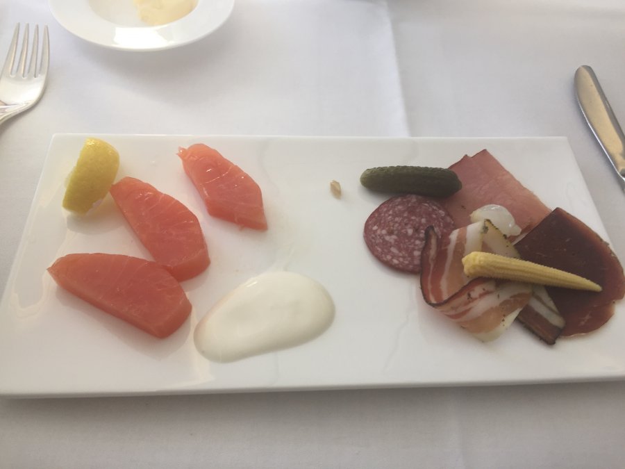Kort efter start påbörjades serveringen. Upp fälldes bordet som kändes gigantiskt stort. Efter att tag slår det mig att tanken är att om man reser i sällskap så kan man sitta mitt emot varandra och äta middag! Middagsserveringen började med en förrättsvagn som bjöd på mycket gott. Jag valde lax och blandade lufttorkade skinkor, framför allt laxen var enormt bra! Efter det följde en äppelsoppa med bacon, även den utomordentligt god. Jag kom på mig själv med att småle mer eller mindre hela tiden från det att jag klev ombord!
