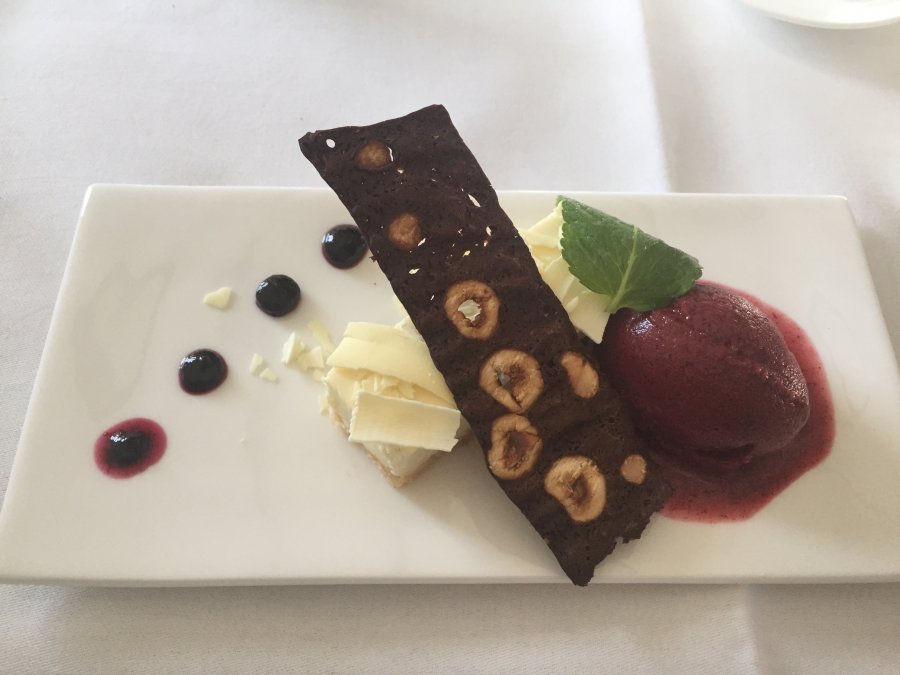 Till huvudrätt valde jag kalvfilé och kalvkind. Av alla rätter under middagen var den sämst, men den höll ändå väldigt hög kvalitet. Avslutningsvis blev det ett antal ostar och sedan vad man på Swiss kallar ”Alpine dream”, en underbart god efterrätt med blåbärssorbet, coulis och vit chokladmousse.