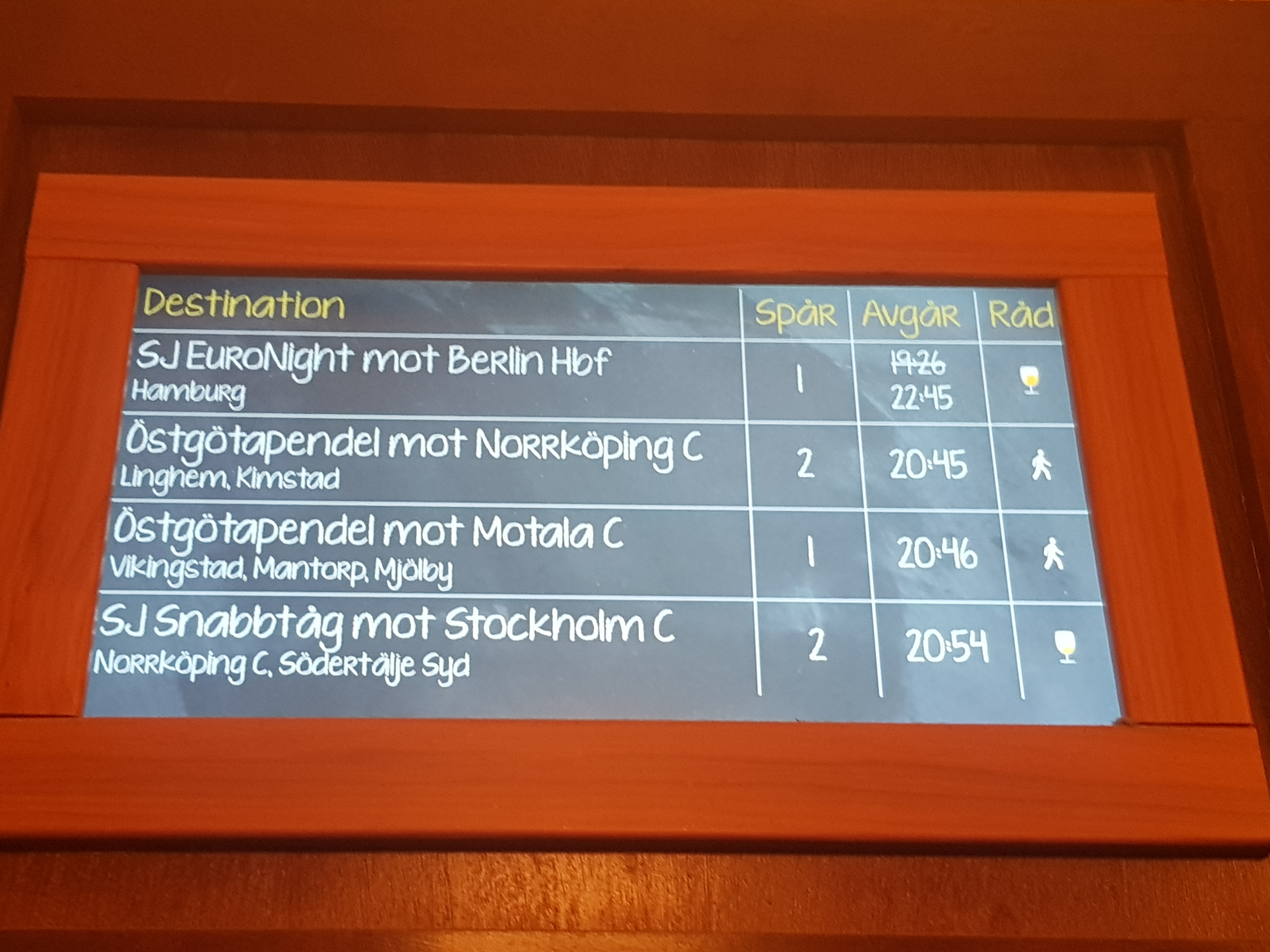 Till sist ett extra plus för monitorer som visade avgångstider från Linköping C inkluderande en antydning om man hinner en öl till eller inte...