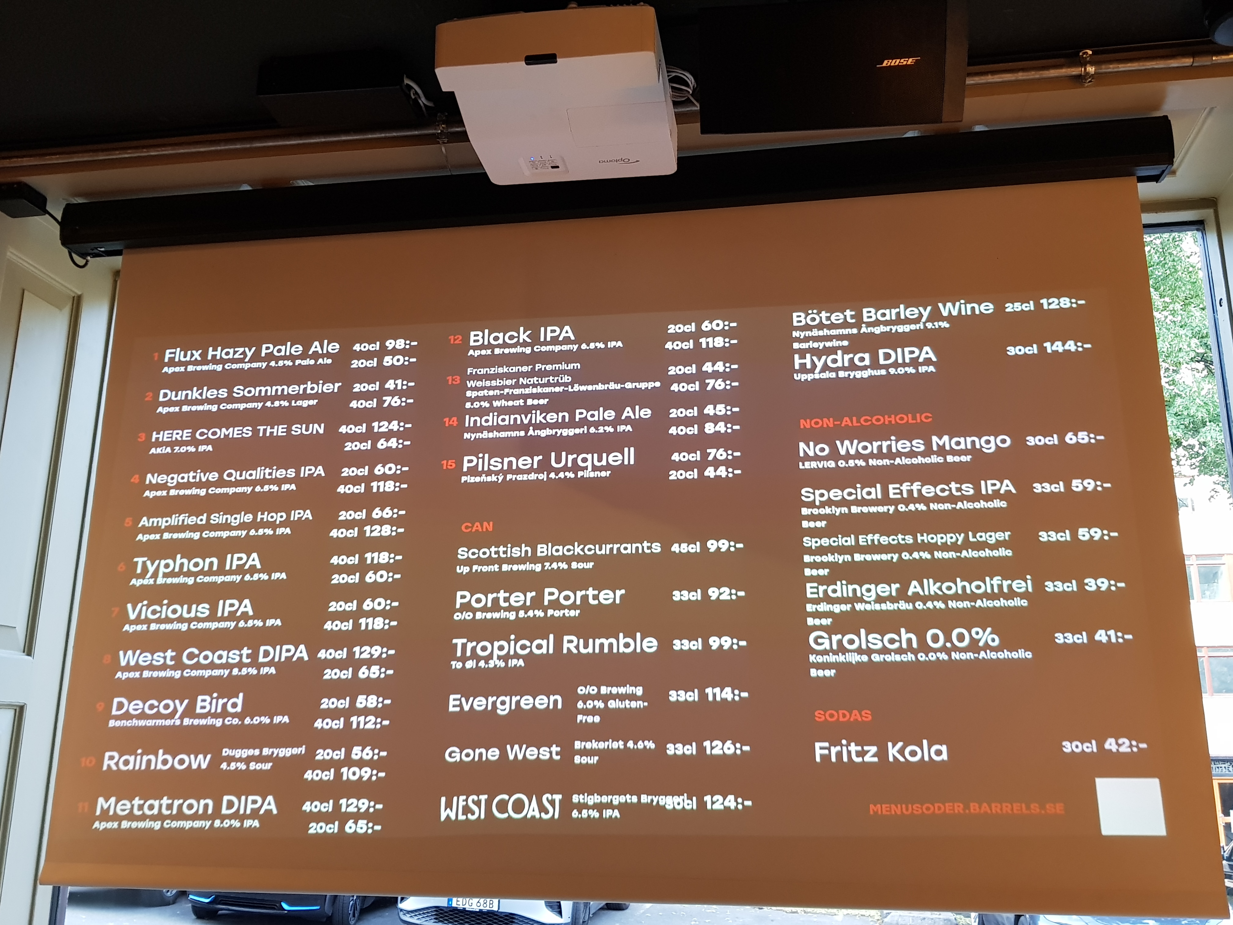 Kvällens utbud bestod av fyra öl på tapp från Mariatorget, kompletterat med en öl från Track och en öl från Beak. I kylskåpet fanns ytterligare knappt tio öl från Mariatorget på flaska och burk.