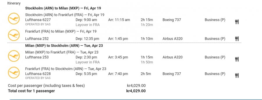 Skall åka till Milano våren 2019. Söker efter biljetter som ger bäst med EB poäng till ett "rimligt" pris (se budget). Layovers går bra och besöker gärna trevliga loungar. Är EBG för tillfället. Jag kan i princip använda hela dagarna för departure/arrival för resandet.