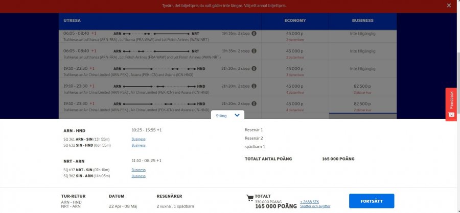 Hade hoppats på att kunna posta min lyckade bokning här i tråden, då jag var riktigt nöjd med det jag tillslut fann: Singapore airlines T/R A350 samt A380 (se bild). Tyvärr sätter ett felmeddelande stopp för detta ("Tyvärr, det biljettpris du valt gäller inte längre. Välj ett annat biljettpris."),vilket jag får upp oavsett hur jag bokar och har försökt hela dagen med olika varianter, har 180k poäng. Verkar vara ett känt fel? Är tyvärr inte EBG så kan inte komma fram till supporten idag, skickade ett mail som jag antar kommer hjälpa föga. Bara att skaffa en ny voucher antar jag... Hade tydligen två som gick ut idag. Skulle bokat via Tallinn när jag kom fram idag efter några timmar i kö, men de hittade inte denna resa? Då gör jag väl det själv tänkte jag... Aja, Gott nytt år och tack för hjälpen!