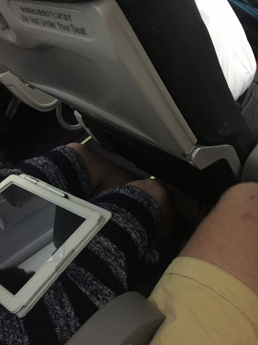 Hamnade bakom vingarna i mitten på raden. Här började min oro om en obekväm resa väckas. En oro om att behöva trängas i tre och en halv timme, räcker med att jag redan har trångt med utrymmet på ett vanligt plan. Läste även på Vanilas hemsida att det fanns stolar som ej går att luta. Men till min stora förvåning var benutrymme acceptabelt, skulle kunna jämföras med en Norwegian resa. Lite trångt om benutrymme men det överlever man. (se bilder). Stolen gick att luta och var lagom bred. En nackdel med stolarna är att dem är fruktansvärt tunna känner varje rörelse person bakom mig gör, genom stolsryggen.