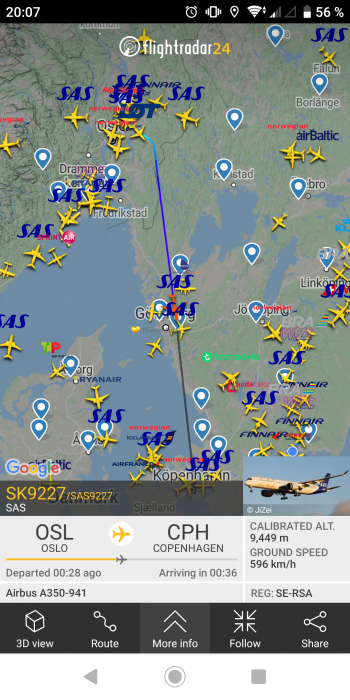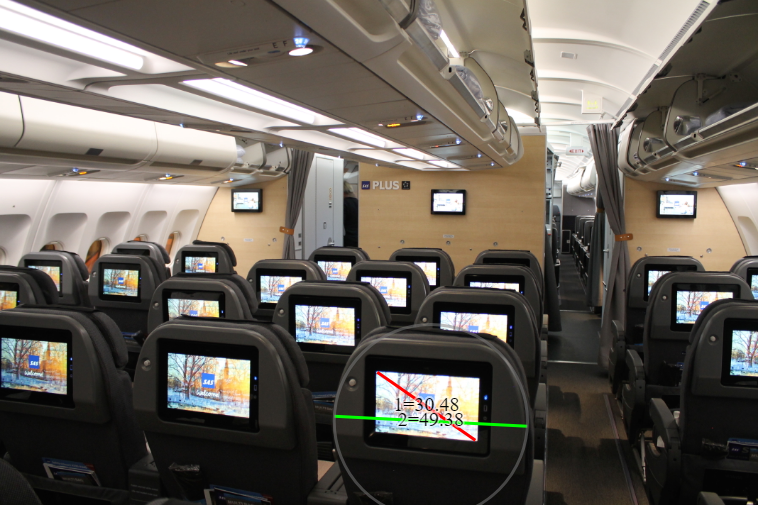 Roade mig med att mäta lite på plus-kabinen på A350 vs. A330. Givet en känd IFE-storlek på 13.3 inches för A350 (33.78 cm) och 12 inches för A330 (30.48 cm) kan man, lite snabbt, få en approximativ stolsbredd i de två planen. Skillnaden mellan de två planen (med hyfsat stora mätosäkerheter) blev 8 mm i A330 fördel (se bilderna nedan, första bilden A350, andra bilen A330). Men bilden från A350n är något mer lutad, vilket bör ge en lite konservativ bedömning av avståndet, rent trigonometriskt.