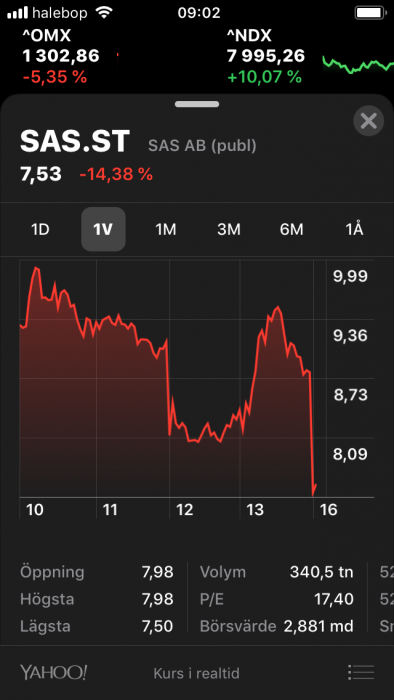 @Ludvig Skalme Nu har SAS testat stödet runt kr.8 tre gånger och studsat upp på ett bra sätt till kr.9 nivå efter det. Rasar vi under detta under hög volym idag ser jag, dessvärre för er med större innehav, nästa nivå på kr.5-6.