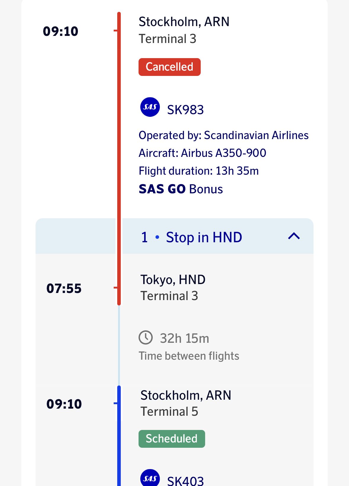 Then it gets worse and it looks like this when you expand it. It looks like I had a direct flight from Stockholm to Tokyo from terminal 3 at Arlanda(!). All that is wrong. The app has taken my original departure time, added in the “terminal 3” from Copenhagen that’s just missing and added my original departure time. It’s a mess.