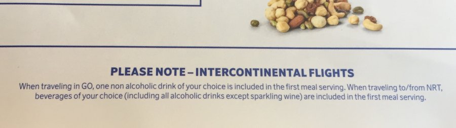 Vad är logiken att om man åker i Go på Intercontinentala linjer ingår EN alkoholfri dryck vid första serveringen men inte om du åker till/från NRT, för då ingår ALL dryck inklusive alkohol (förutom mousserande vin). Borde inte vad som ingår och inte, vara detsamma på alla långlinjer?