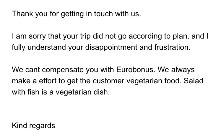 Det finns olika nivåer av vegetarian. Vissa tycker att det är OK med fisk vissa inte (vegan).Reste ARN-CHP-BOS förra veckan, wifi fungerade varken dit eller hem, stolen i business levde sitt egna liv. Flög plus hem och tydligen fanns det ingen vegetarisk kost registrerad på mig, flygvärdinnan sa att det var vanlig mat eller ingen mat så tog en bricka gör att iallafall kunna äta salladen. Även salladen innehöll fisk. Fyllde i SAS feedback när jag kom hem och sa inget om kompensation och fick ett svar som jag inte förväntade mig.