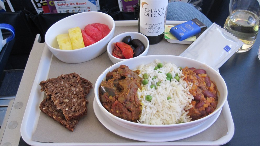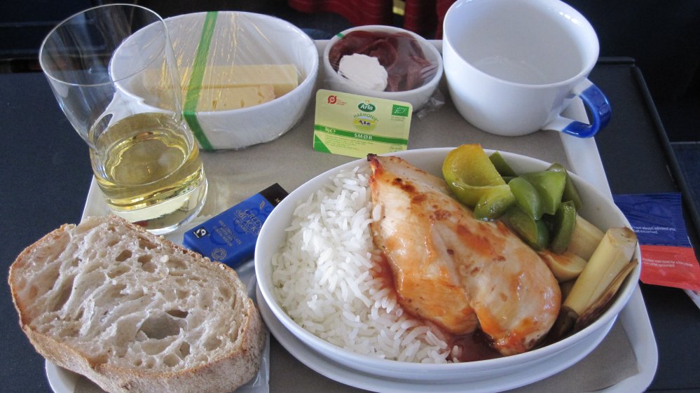 Min resesällskap tog den vanliga som serverades. Jag smakade det också och kan säga att det var länge sen när man fått kyckling på flyget som inte var torr utan saftig och jätte gott.