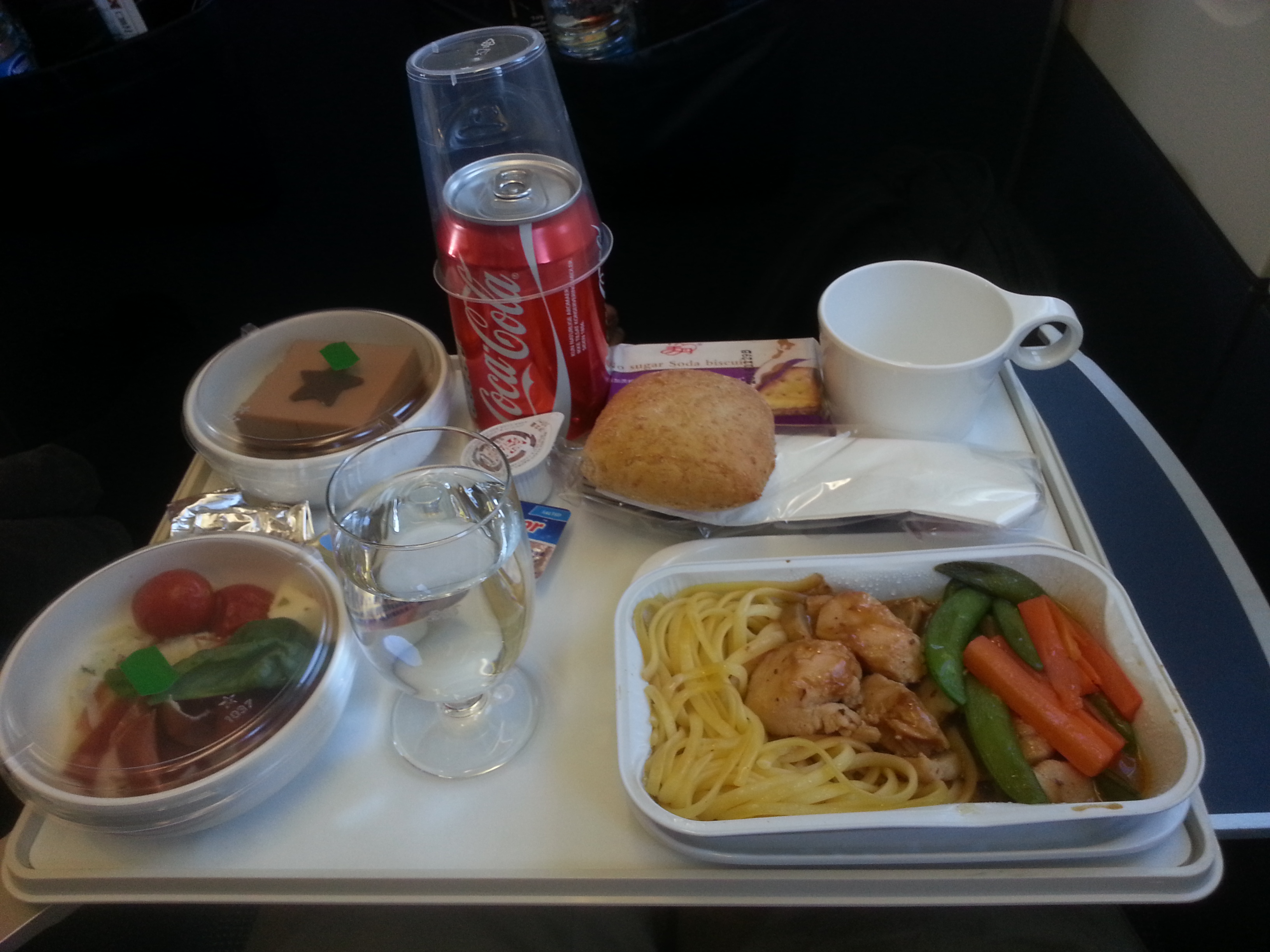 Så fort vi kommit upp i luften bjöd de på fördrink och nötter. Strax senare kom dom ut med middagen som bestod av antingen kyckling eller fisk. Dryck till maten serverades i riktiga glas! Servicen genom hela flygningen upplevde jag även som mycket bra.