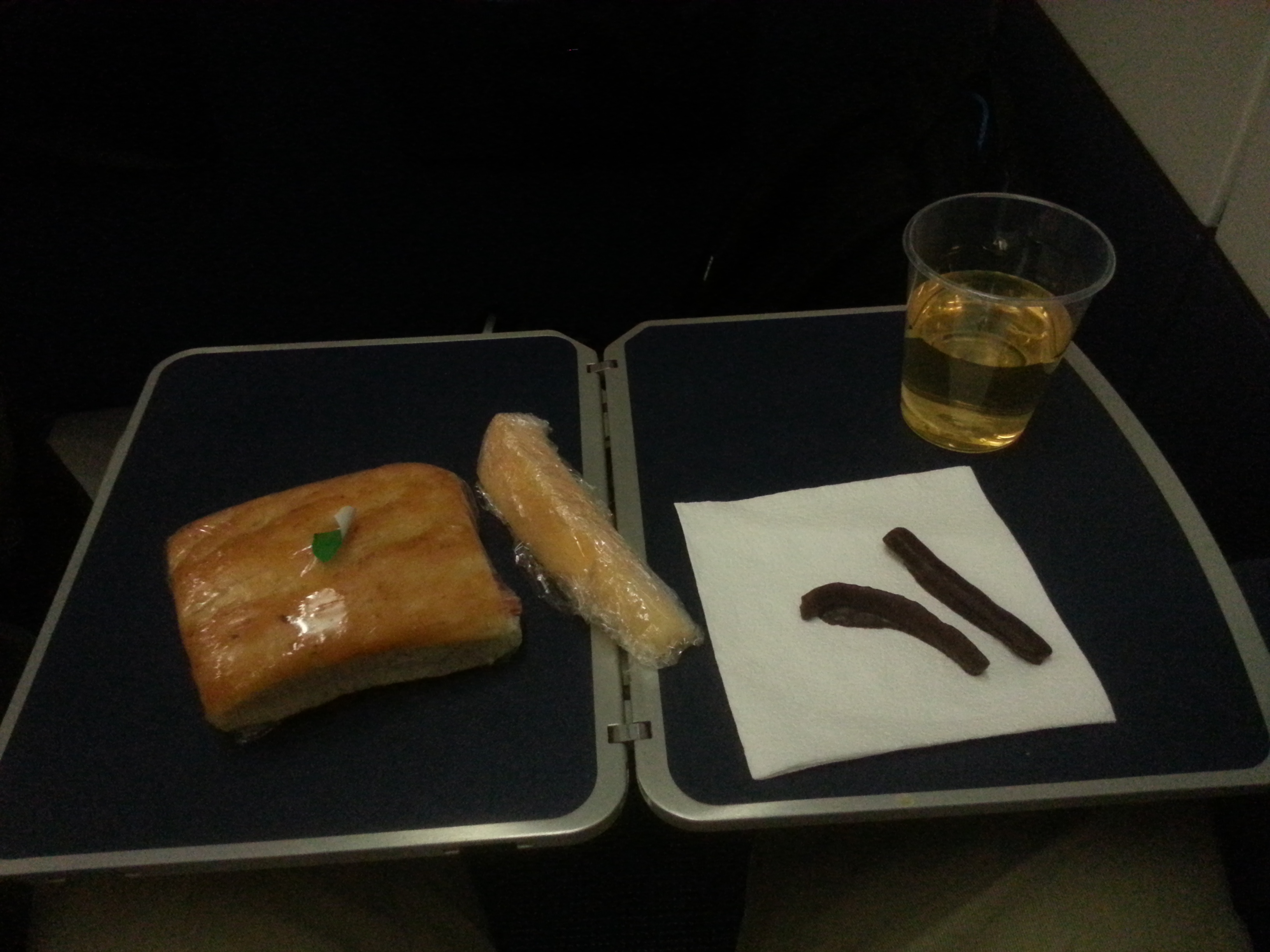 Ungefär halvvägs in i flygningen rullade de ut vagnarna igen och serverade ett lättare mellanmål bestående av smörgåsar, frukt och choklad samt mer dricka om man ville ha. Strax innan landning serverades köttgryta med klyftpotatis till middag som även den smakade bra.